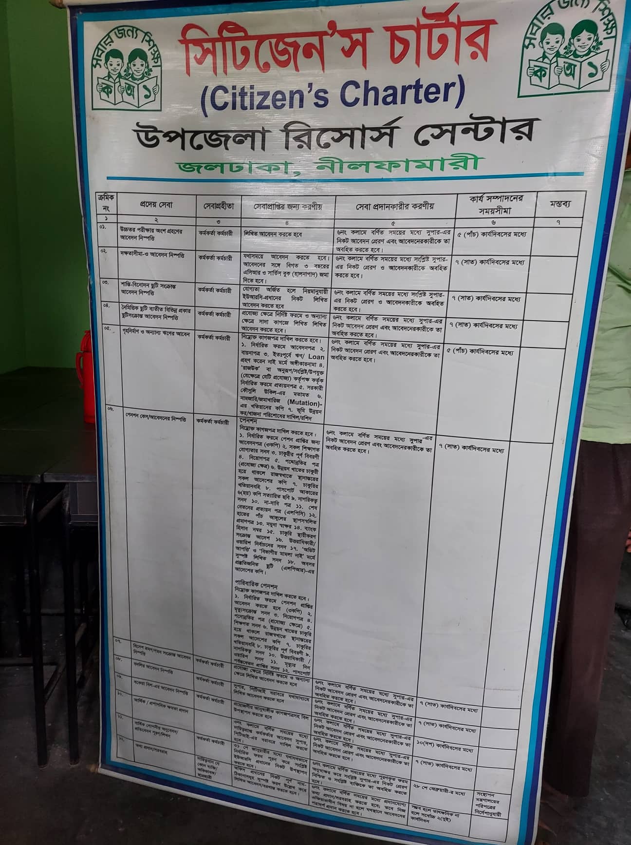| ক্রমিক নং | প্রদেয় সেবা | সেবাগ্রহীতা | সেবারপ্তীর জন্য করনীয় | সেবা প্রদানকারীর করনীয় | কার্য সম্পাদনের সময়সীমা | মন্তব্য |